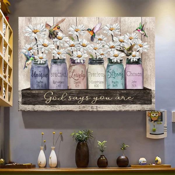 Christian Home Decor, White Daisy Painting Colorful Hummingbird God Says You Are Canvas Wall Art ,Christian Canvas Revitalize your space with our top-tier canvas poster, boasting high-quality prints that bring your cherished images to vivid life. Crafted from sturdy, fade-resistant material, this poster exudes a classic charm that enhances the elegance of any room. Whether you want to display artwork, photography, or motivational quotes, it’s the perfect way to infuse your personal style into your home or office